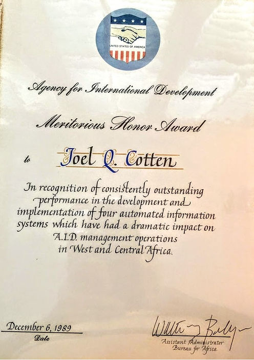 One final note before leaving the subject of my Haiti tour. Shortly after returning to Washington, USAID Haiti was awarded a unit citation for the work we did. I was proud to be one of the recipients of this award, which was presented in a special program at the State Department. The Citation, displayed below, says it all.
